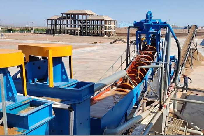 砂石通過(guò)鏟車進(jìn)入料倉(cāng),然后經(jīng)過(guò)輸送帶進(jìn)行雙缸擦洗機(jī),進(jìn)行擦洗。隨后,物料經(jīng)過(guò)螺旋洗砂機(jī)、細(xì)沙回收機(jī)、脫水篩進(jìn)行清洗、脫水回收,成品砂通過(guò)傳送帶運(yùn)至堆場(chǎng);