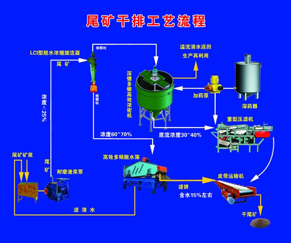商洛某釩礦廠,500t/d釩尾礦,濃度25%,粒度粗于100目含70%左右,用干排篩可提取95%以上干礦量,干排 后的尾礦渣含水小于20%。尾礦干排后尾礦用于建筑材料,尾礦資源重利用;底流可直接回水利用,完全不用尾礦庫。回水回報