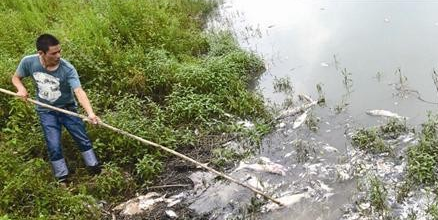 隆中調(diào)查員在葉美琴的養(yǎng)魚場邊看到,養(yǎng)魚場共分三塊,20多畝。池水渾濁,池旁還漂有幾十只死魚!八麄儸F(xiàn)在還在那里洗沙,污水還在繼續(xù)流向魚池!比~美琴指著離養(yǎng)魚場50多米遠的一個沙場說。
