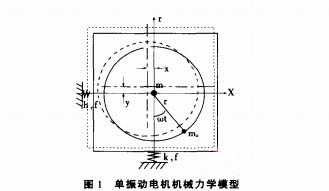 振動電機(jī)偏重塊質(zhì)量m n,以偏心距7和角速度力響應(yīng),作與激振力相同角頻率的平面回轉(zhuǎn)諧運(yùn)動,篩體平面回轉(zhuǎn)角速度與激振力角速度相同。由于篩體位移落后激振力180度,所以,固定在篩體上的振動電機(jī),其偏重塊受篩體牽連,作與篩體反方向的牽連運(yùn)動,產(chǎn)生反向牽連運(yùn)動慣性力,設(shè)支承彈簧剛度為k,阻尼系數(shù)為f。該振動機(jī)械的力學(xué)模型如圖1所示。