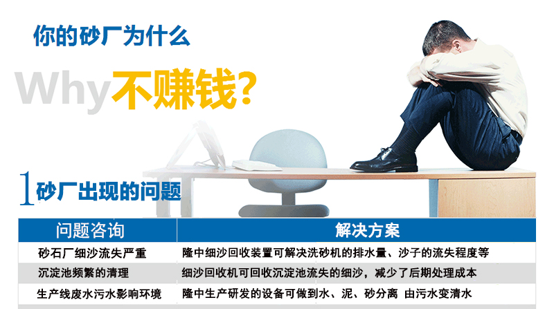 下面我們就分析儀下投資一臺(tái)細(xì)沙回收機(jī)所帶來的經(jīng)濟(jì)效益:正常濕法篩分生產(chǎn)線廢水中細(xì)沙的含量應(yīng)為15%-20%.假設(shè)砂石料生產(chǎn)線產(chǎn)量為100噸/小時(shí).濕法篩分.則洗砂機(jī)排出的廢水中細(xì)砂含量為:100噸/小時(shí)×15%=15噸/小時(shí).經(jīng)細(xì)沙回收系統(tǒng)處理后.可提取細(xì)砂:15噸/小時(shí)×83%=12.45噸/小時(shí).一年可提取細(xì)砂:12.45噸/小時(shí)×8小時(shí)×260天=25896噸.細(xì)沙按25元/噸算:25896噸×25元/噸=64.74萬元.除去設(shè)備運(yùn)行成本和維修費(fèi)用約為10萬年/年.一年收益55萬元.細(xì)砂得到回收.減少了沉淀池的工作量.降低了沉淀池的清理成本.