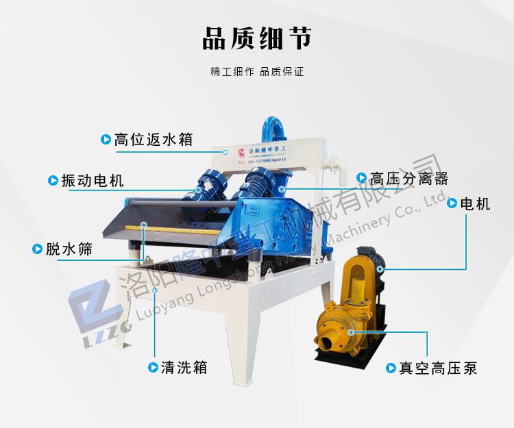 5、旋流器:將旋流器安裝在回料箱上的槽鋼支座上將回流彎管與出水口對(duì)接好,彎管下端插入回料箱內(nèi)并與上蓋板焊牢,細(xì)沙回收裝旋流器前端出料箱,裝螺栓并緊固。裝Φ76mm入料橡膠管,下端與泵出水口管連接并用鐵絲箍緊。